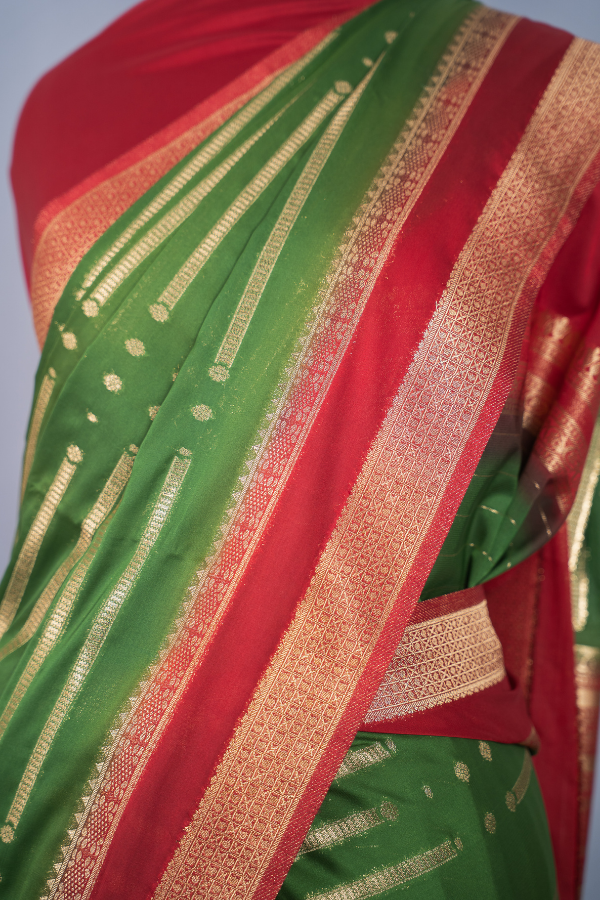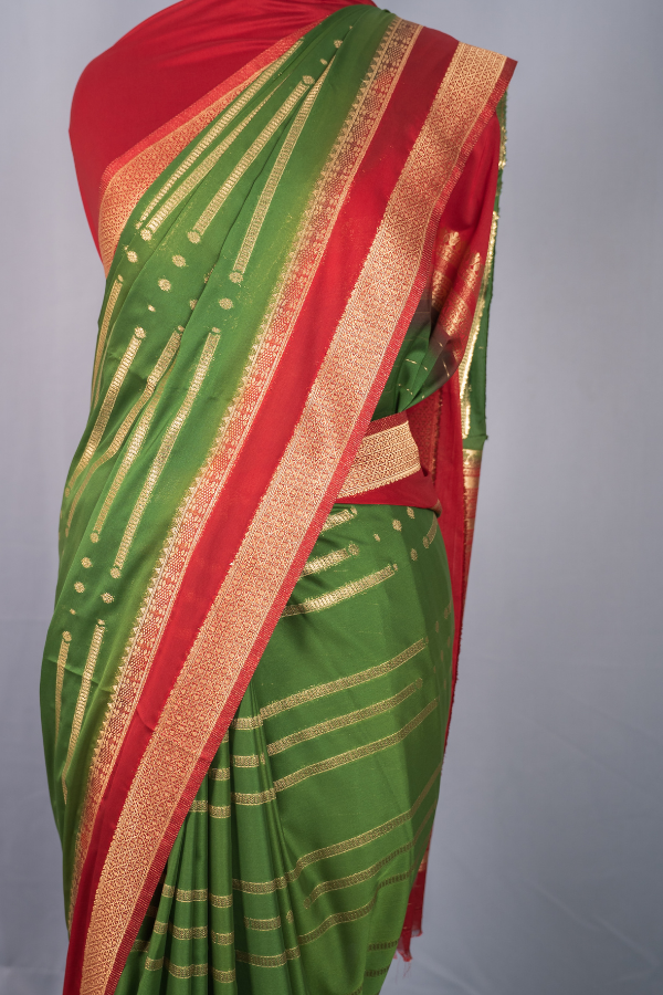 2D Pattern Semi Mysore Silk Crape With Golden Line All Over The Body – Light Green With Red