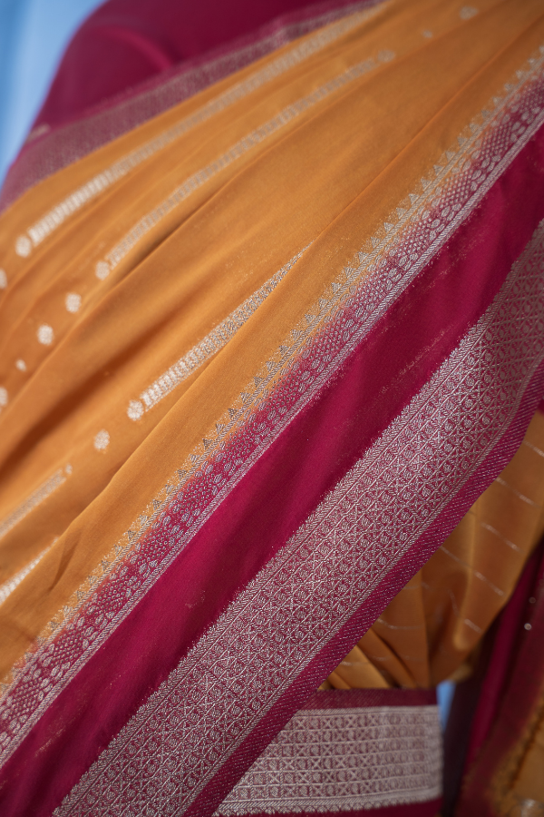 Experience the grandeur of tradition with our silk saree, a creation that echoes heritage and artistry. Crafted from finest-grade silk, this saree glows with rich texture and timeless allure. The golden zari detailing dances across the drape, creating a regal harmony of elegance and sophistication. Light yet opulent, this saree is perfect for wedding festivities, pujas, or grand celebrations. The shimmering zari motifs and rich silk texture bring an air of royalty that never fades.