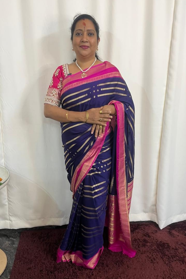 Be the first to review “2D Pattern Semi Mysore Silk Crape With Golden Line All Over The Body – Navy Blue With Pink”