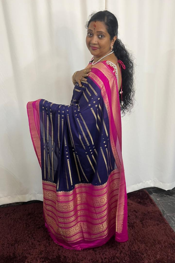 2D Pattern Semi Mysore Silk Crape With Golden Line All Over The Body – Navy Blue With Pink