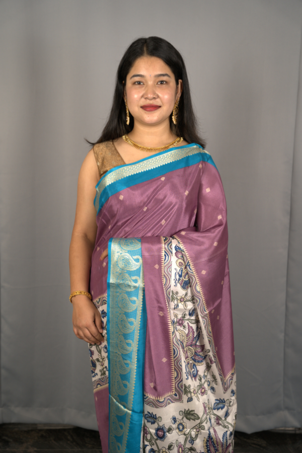 Experience the grandeur of tradition with our silk saree, a creation that echoes heritage and artistry. Crafted from finest-grade silk, this saree glows with rich texture and timeless allure. The golden zari detailing dances across the drape, creating a regal harmony of elegance and sophistication. Light yet opulent, this saree is perfect for wedding festivities, pujas, or grand celebrations. The shimmering zari motifs and rich silk texture bring an air of royalty that never fades.