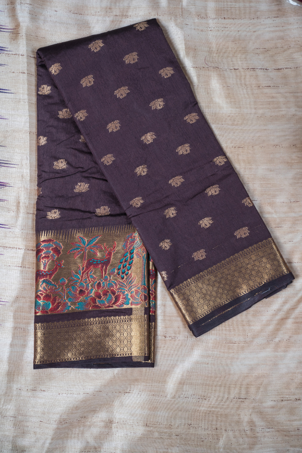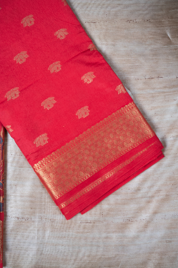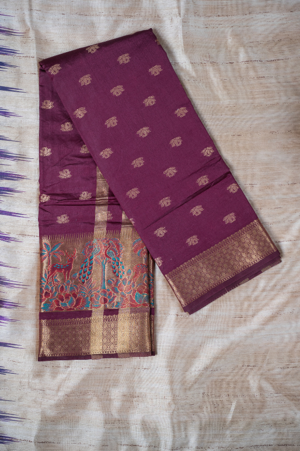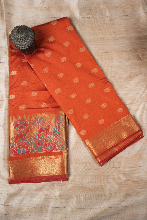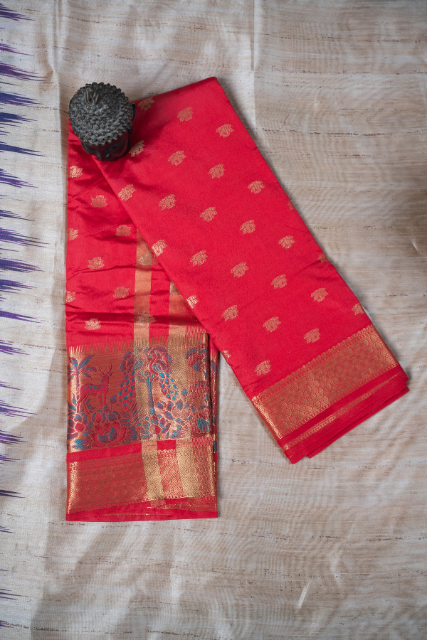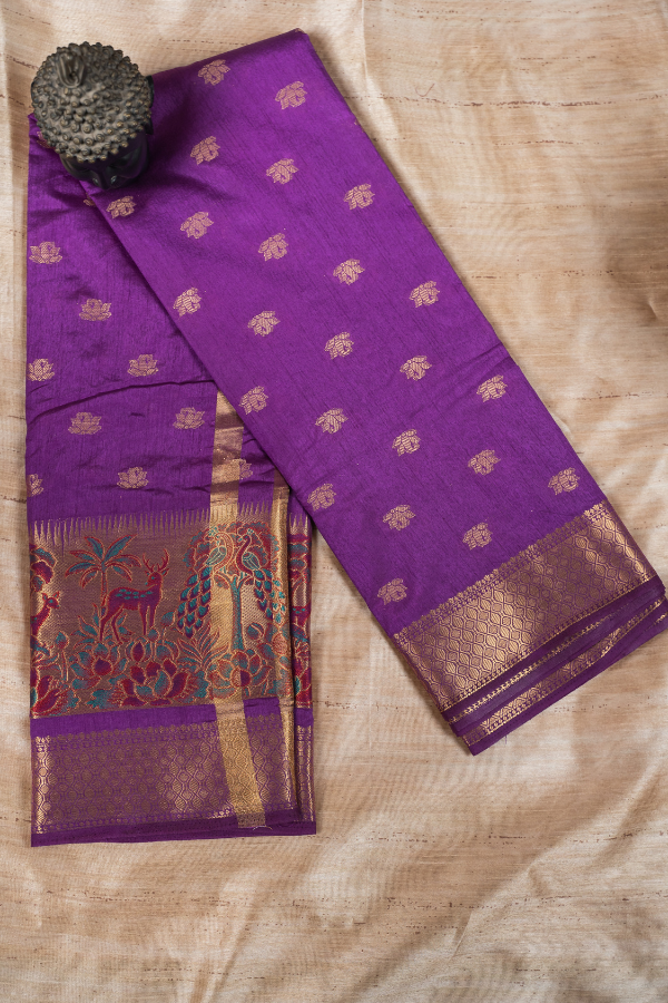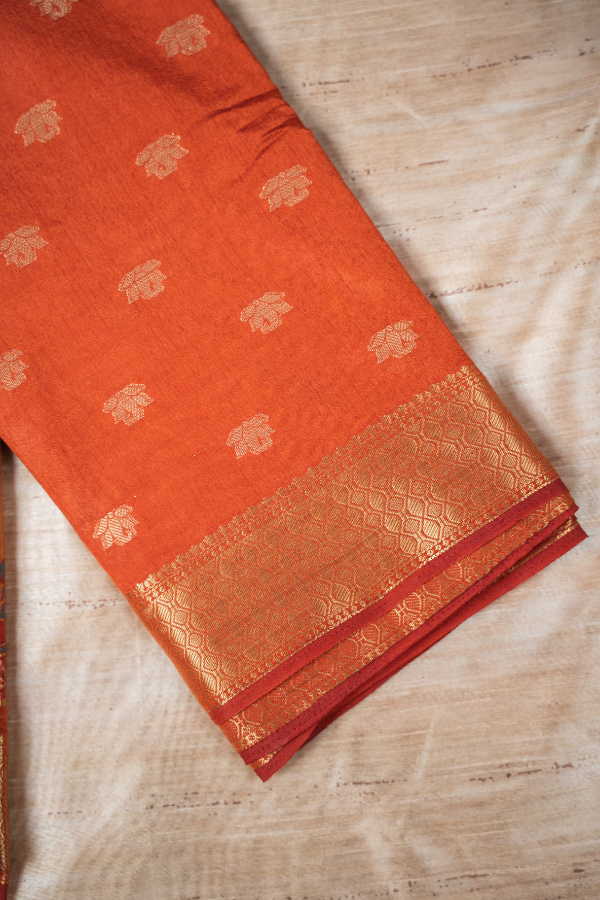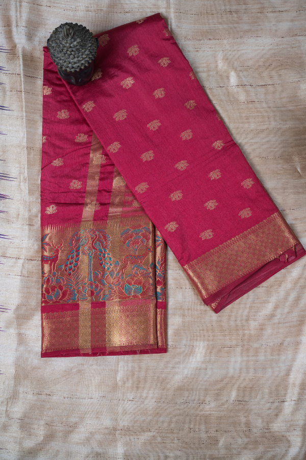 Experience the grandeur of tradition with our silk saree, a creation that echoes heritage and artistry. Crafted from finest-grade silk, this saree glows with rich texture and timeless allure. The golden zari detailing dances across the drape, creating a regal harmony of elegance and sophistication. Light yet opulent, this saree is perfect for wedding festivities, pujas, or grand celebrations. The shimmering zari motifs and rich silk texture bring an air of royalty that never fades.