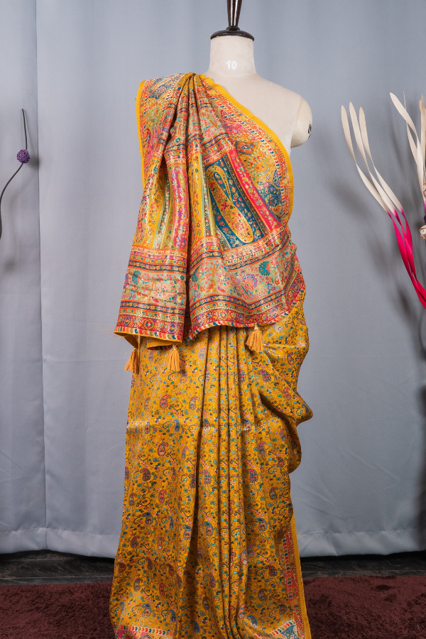 Experience the grandeur of tradition with our silk saree, a creation that echoes heritage and artistry. Crafted from finest-grade silk, this saree glows with rich texture and timeless allure. The golden zari detailing dances across the drape, creating a regal harmony of elegance and sophistication. Light yet opulent, this saree is perfect for wedding festivities, pujas, or grand celebrations. The shimmering zari motifs and rich silk texture bring an air of royalty that never fades.