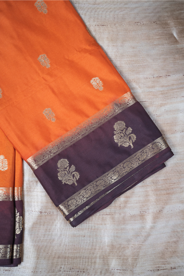Semi Mysore Silk Crape All Over Body Buttas With Bentex Butta Border And 2D Pattern – Orange With Brown