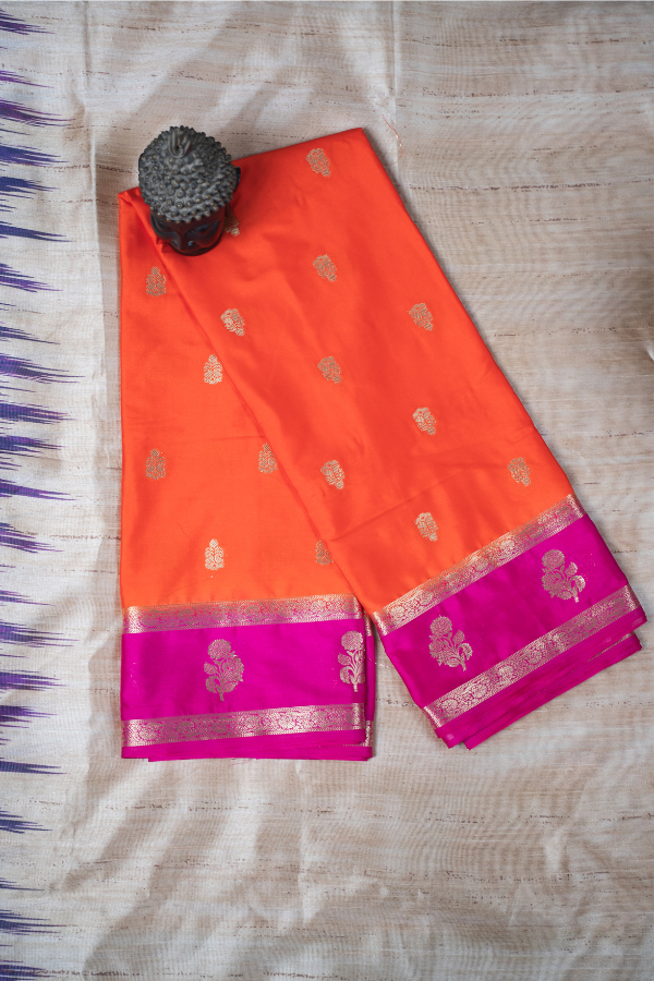 Be the first to review “Semi Mysore Silk Crape All Over Body Buttas With Bentex Butta Border And 2D Pattern – Orange With Pink”