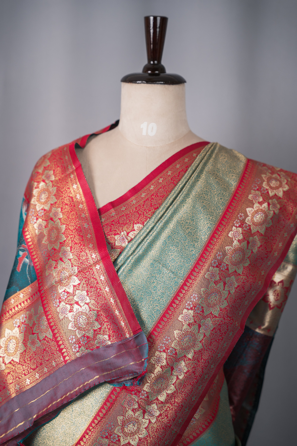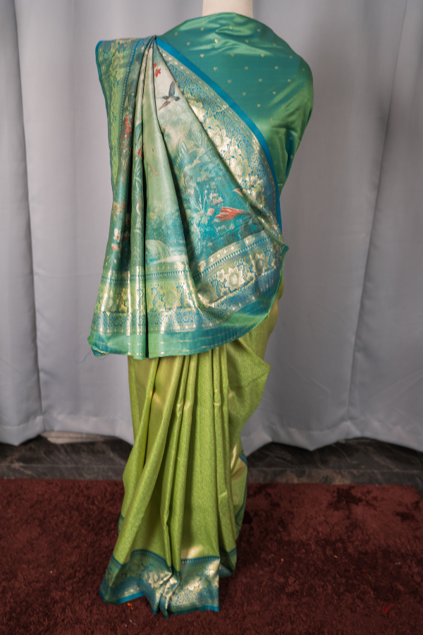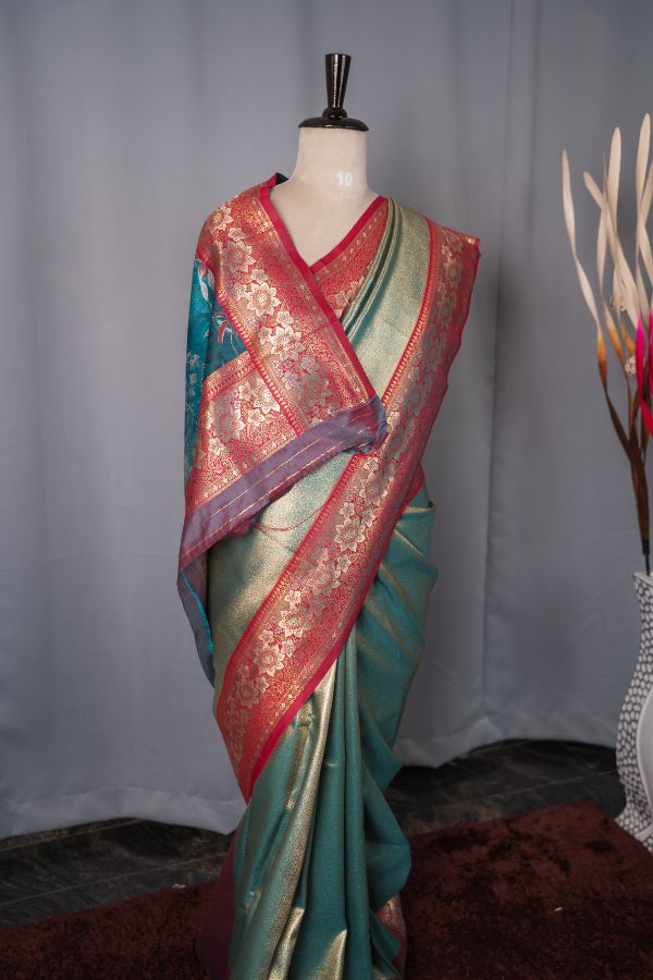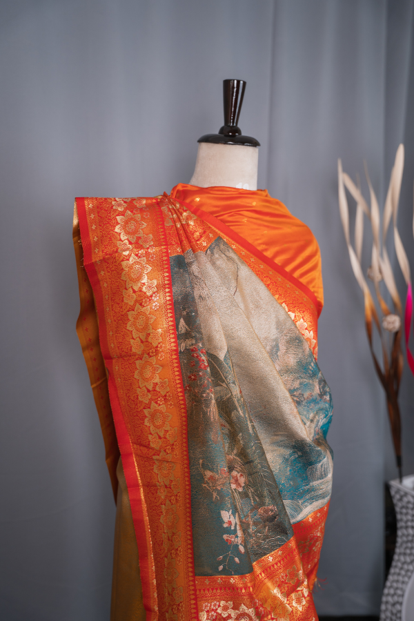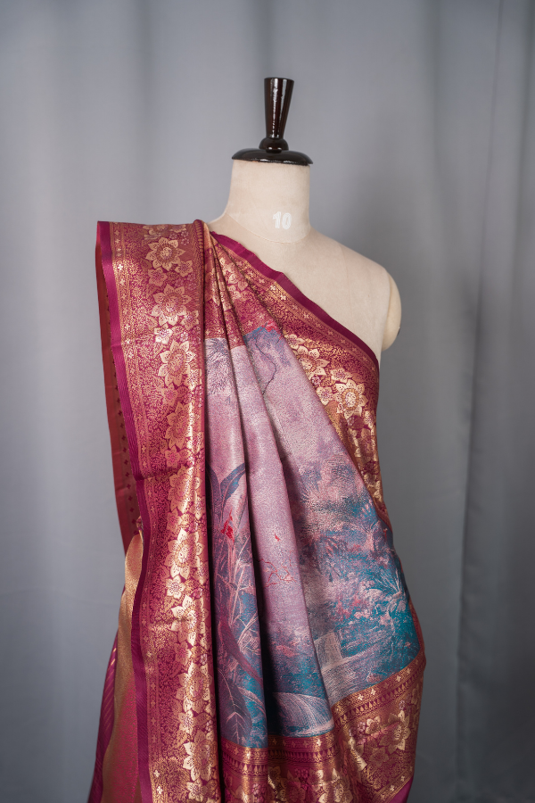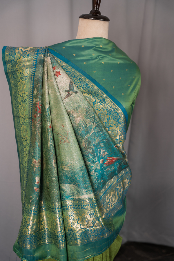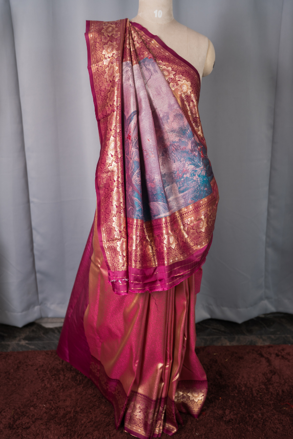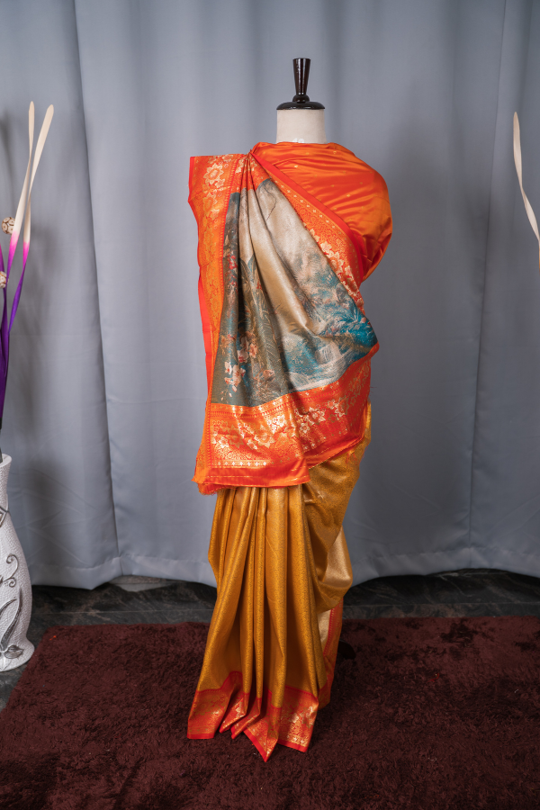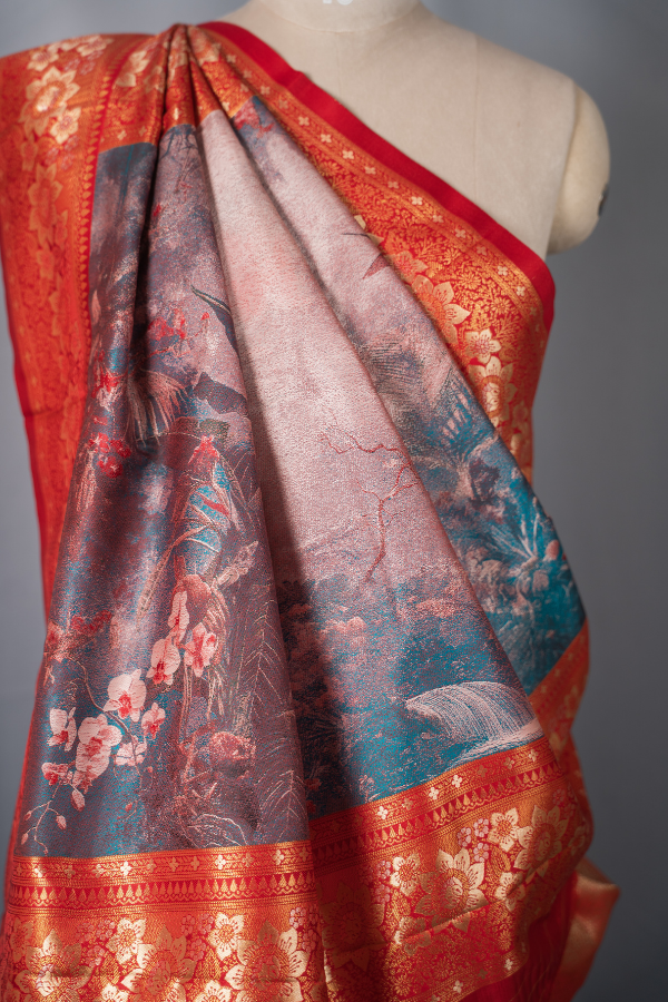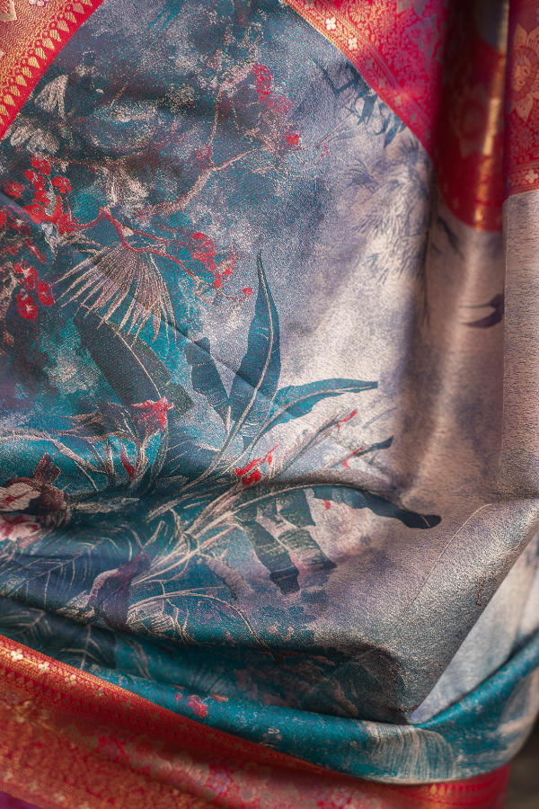 Embrace the allure of Banarasi elegance with our Banaras Digital Printed Soft Silk Saree, where timeless weaving meets contemporary design. Crafted from luxurious soft silk, this saree showcases exquisite digital prints inspired by traditional motifs and modern artistry. Its smooth texture and lightweight drape make it a perfect blend of comfort and sophistication, ideal for festive occasions, parties, or cultural celebrations. Every fold reflects a delicate sheen, bringing forth the charm and refinement that defines Banaras craftsmanship.
