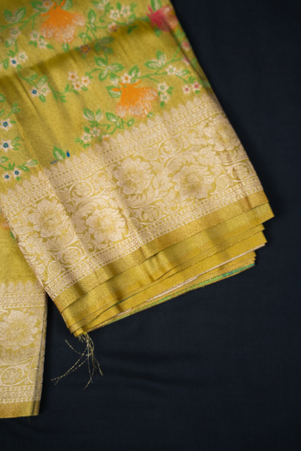 Experience the grandeur of tradition with our tissue saree, a creation that echoes heritage and artistry. Crafted from finest-grade silk, this saree glows with rich texture and timeless allure. The golden zari detailing dances across the drape, creating a regal harmony of elegance and sophistication. Light yet opulent, this saree is perfect for wedding festivities, pujas, or grand celebrations. The shimmering zari motifs and rich silk texture bring an air of royalty that never fades.