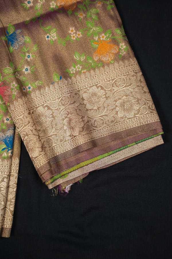Experience the grandeur of tradition with our tissue saree, a creation that echoes heritage and artistry. Crafted from finest-grade silk, this saree glows with rich texture and timeless allure. The golden zari detailing dances across the drape, creating a regal harmony of elegance and sophistication. Light yet opulent, this saree is perfect for wedding festivities, pujas, or grand celebrations. The shimmering zari motifs and rich silk texture bring an air of royalty that never fades.