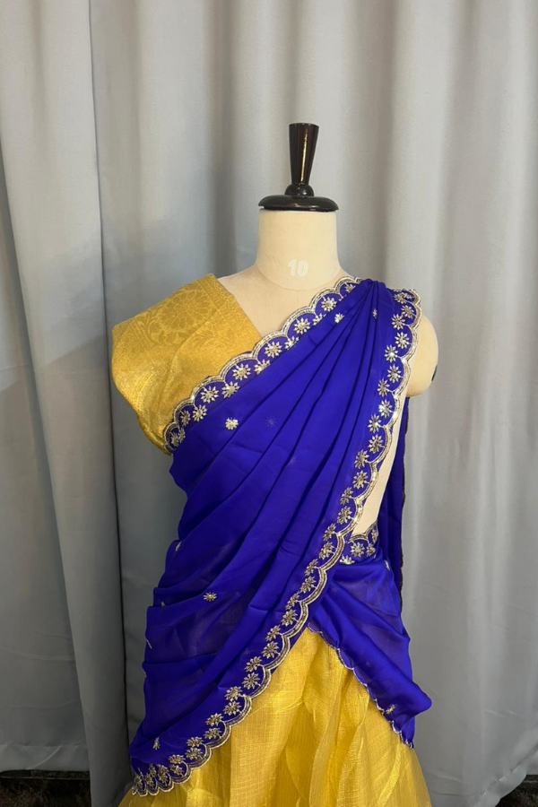 Be the first to review “Tissue Golden Jari Lehenga With Contrast Blue Dupatta”